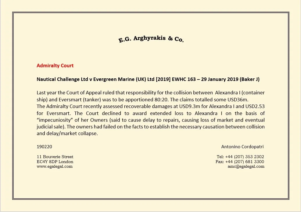“Last year the Court of Appeal ruled that responsibility for the collision between Alexandra I (container ship) and Eversmart (tanker) was to be apportioned 80:20. The claims totalled some USD36m. The Admiralty Court recently assessed recoverable damages at USD9.3m for Alexandra I and USD2.53 for Eversmart. The Court declined to award extended loss to Alexandra I on the basis of "impecuniosity" of her Owners (said to cause delay to repairs, causing loss of market and eventual judicial sale). The owners had failed on the facts to establish the necessary causation between collision and delay/market collapse.”