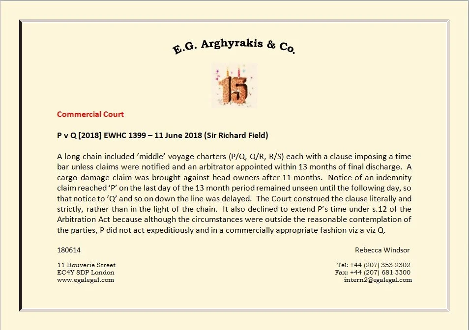 “A long chain included 'middle' voyage charters (P/Q, Q/R, R/S) each with a clause imposing a time bar unless claims were notified and an arbitrator appointed within 13 months of final discharge. A cargo damage claim was brought against head owners after 11 months. Notice of an indemnity claim reached 'P' on the last day of the 13 month period remained unseen until the following day, so that notice to 'Q' and so on down the line was delayed. The Court construed the clause literally and strictly, rather than in the light of the chain. It also declined to extend P's time under s.12 of the Arbitration Act because although the circumstances were outside the reasonable contemplation of the parties, P did not act expeditiously and in a commercially appropriate fashion viz a viz Q.”