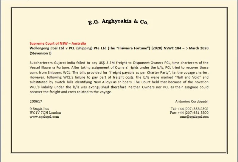 “Subcharterers Gujarat India failed to pay US$ 3.2M freight to Disponent Owners PCL, time charterers of the Vessel Illawarra Fortune. After taking assignment of Owners' rights under the b/Is, PCL tried to recover those sums from Shippers WCL. The bills provided for "freight payable as per Charter Party", i.e. the voyage charter. However, following Wa's failure to pay part of freight costs, the b/Is were marked "Null and Void" and substituted by switch bills identifying New Alloys as shippers. The Court held that because of the novation WCL's liability under the b/Is was extinguished therefore neither Owners nor PCL as their assignee could recover the freight and costs related to the voyage.”